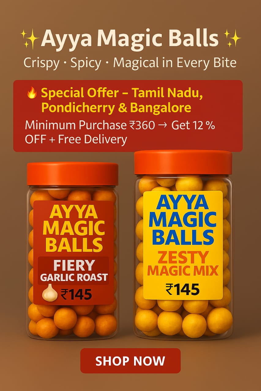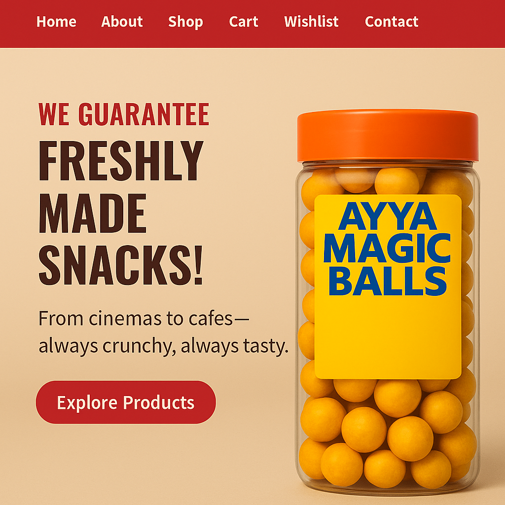 At Shri Sabari Ayyan Foods, we combine traditional recipes with modern technology to craft popcorn, Magic Balls, masala-coated nuts, and makhana that stand out in taste and quality. Our promise of consistency and freshness makes us a trusted choice for theatres, cafés, and retailers.